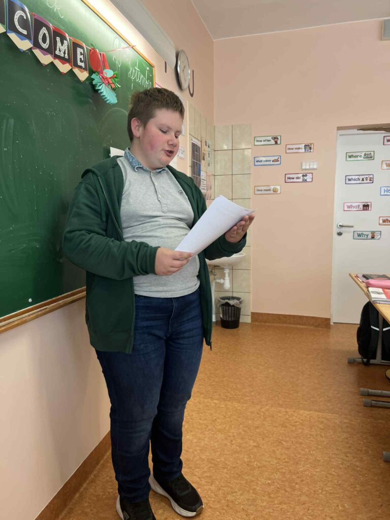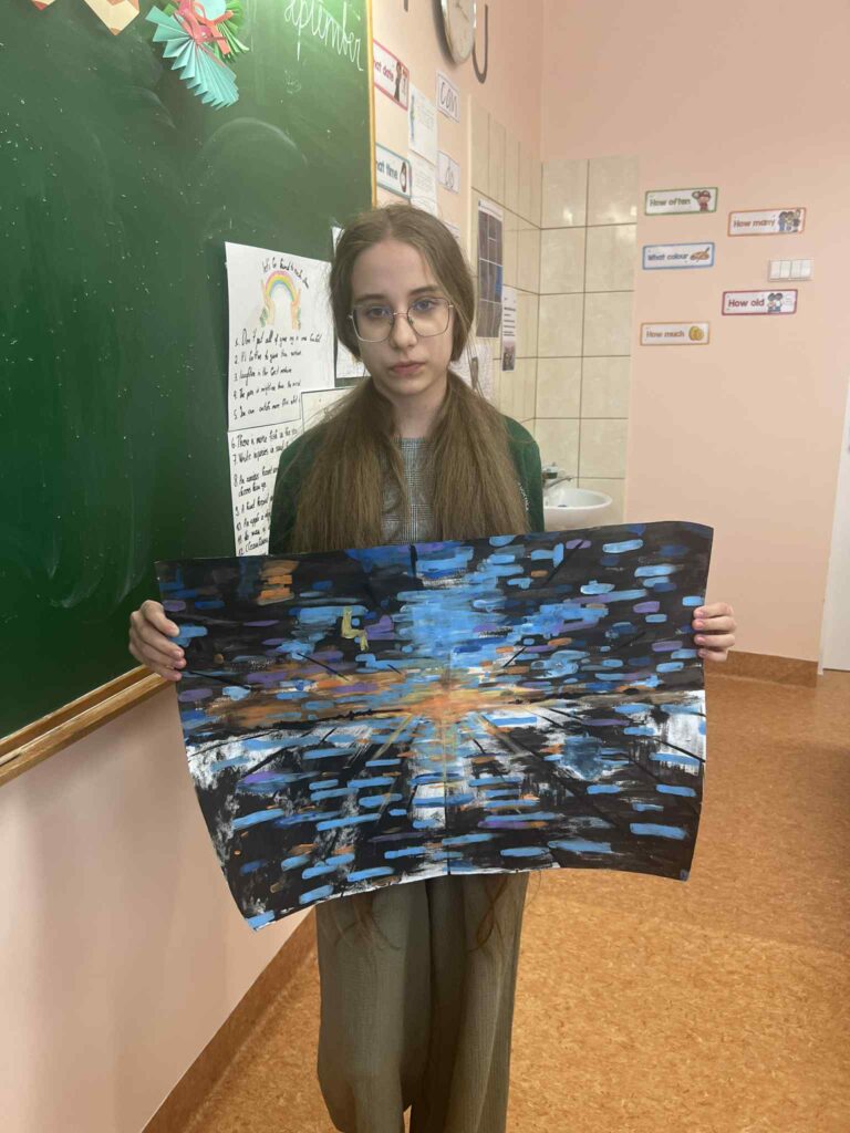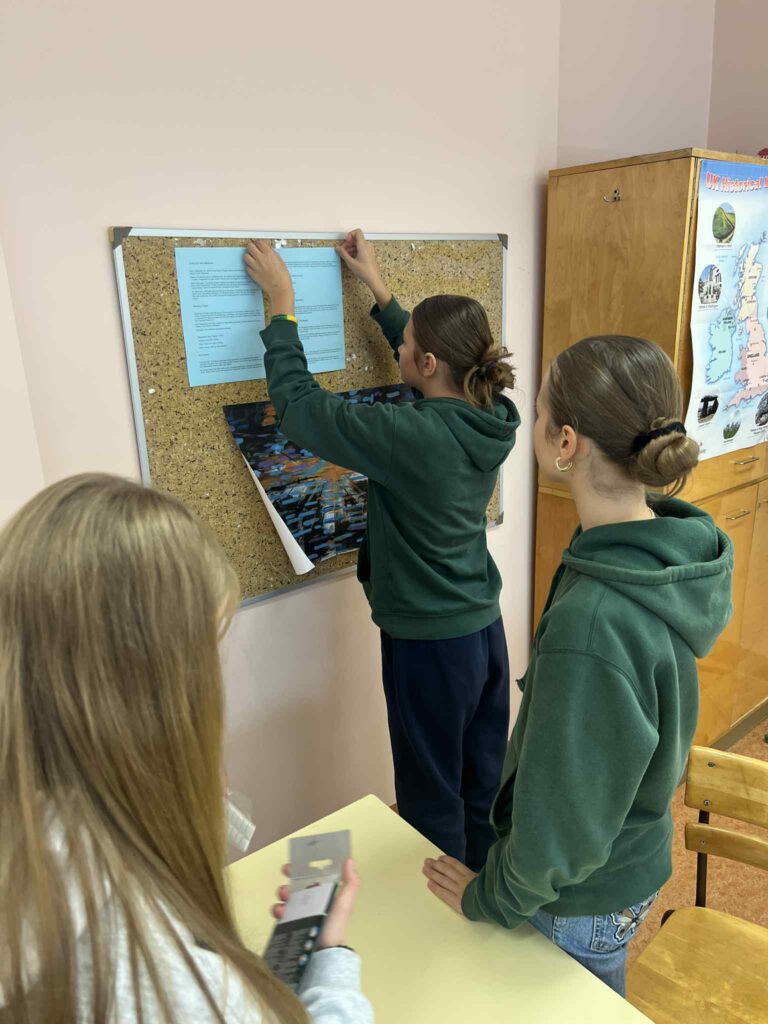 Paskutinėje pamokoje surengėme refleksiją: mokiniai uždavinėjo vieni kitiems klausimus, diskutavo ir dalijosi savo įspūdžiais. Taip pat klasėje parengėme stendą, kuriame anglų kalba pateikta glausta informacija apie M. K. Čiurlionį.