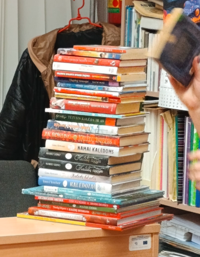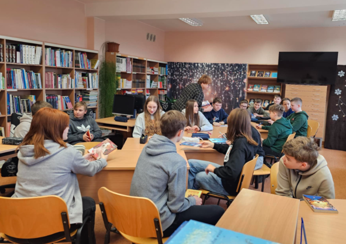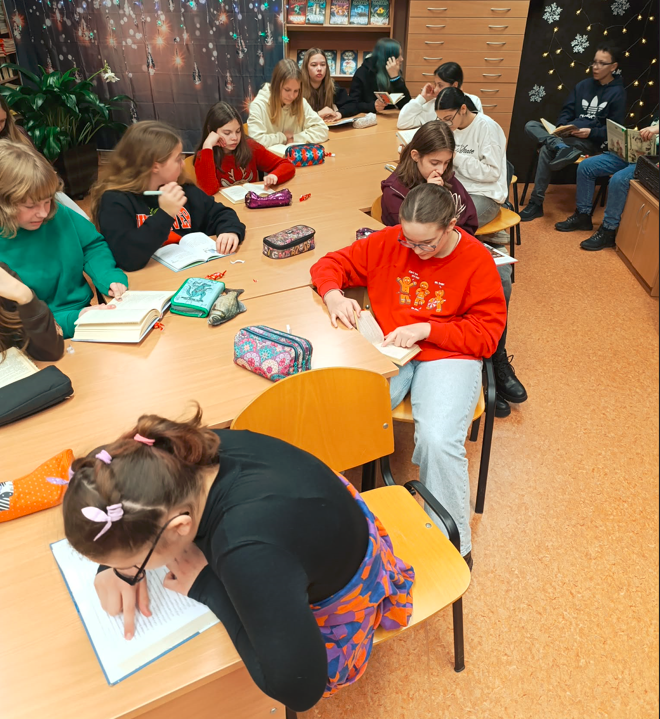 Penktadienį net penkios klasės svečiavosi mokyklos bibliotekoje. Kaip ir kasmet ten vyko netradicinės literatūros pamokos – kalėdiniai skaitymai. Šiemet lietuvių kalbos ir literatūros mokytojos kartu su bibliotekininkėmis pririnko knygų, kurių pavadinime buvo paminėtos Kalėdos arba žiema. Mokiniai burtų keliu gavo knygą, kurią turėjo spontaniškai atsiversti ir tyliai perskaityti atsiverstą puslapį. Iš to puslapio vaikams reikėjo išrinkti vieną sakinį, kuris labiausiai susijęs su Kalėdomis, panašus į kalėdinį palinkėjimą ar išbyrėjusį kalėdinės pasakos trupinėlį. Tą sakinį mokiniai užrašė, pavertė eilėraščio posmu, iliustravo ir, žinoma, garsiai perskaitė.