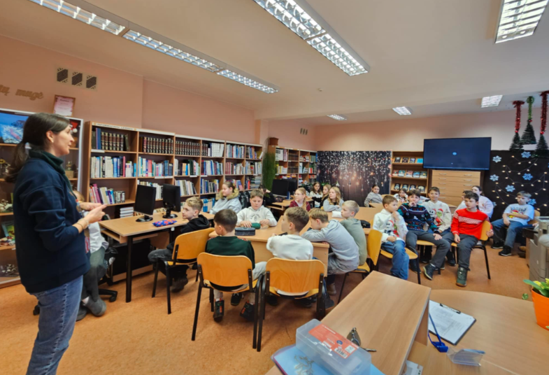 Gruodžio 16 dieną, po pamokų, 1a klasės mokiniai J. Paukštelio bibliotekoje vaikų ir jaunimo erdvėje dalyvavo dviejose edukacijose – skrebinimo ir kalėdinio žaisliuko gaminimo. Skrebinimo edukacijos metu pirmokai susipažino su šia kūrybine technika, mokėsi derinti spalvas, formas ir įvairias dekoratyvines detales. Vaikai kūrė originalius darbelius, lavino vaizduotę, smulkiąją motoriką bei kruopštumą. Žaisliuko gaminimo metu vaikai žaisliuką nudažė akriliniais dažais, o vėliau papuošė įvairiais blizgučiais. Kiekvienas darbelis tapo savitas ir išskirtinis.
