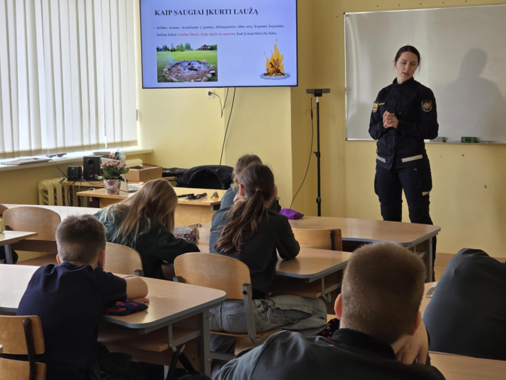 Specialistė taip pat supažindino mokinius su saugaus elgesio prie laužaviečių taisyklėmis: kaip tinkamai įkurti laužą, kokių medžiagų vengti, kaip elgtis vėjo metu ir kodėl visuomet būtina turėti priemonių ugniai užgesinti. Regvita akcentavo, kad atsakingas elgesys gamtoje padeda išvengti nelaimių ir saugo aplinką.
