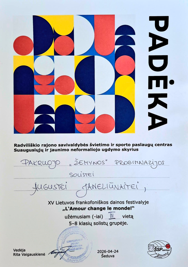 Antrajame šio konkurso etape 5–8 klasių solistų kategorijoje Augustė užėmė 3 vietą.