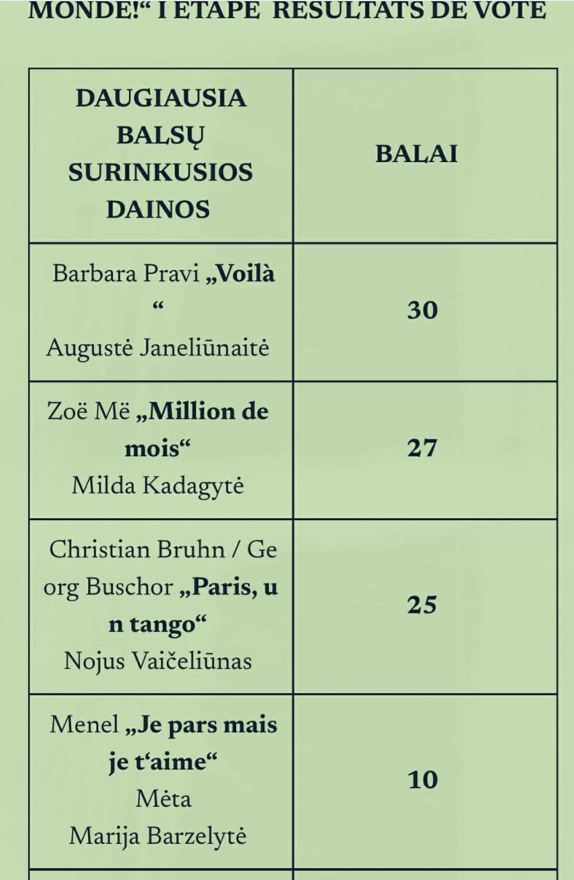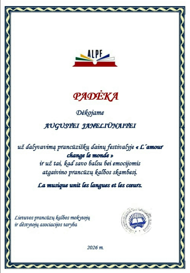 Tai festivalis-konkursas, kuriame savo amžiaus kategorijose varžosi respublikos bendrojo lavinimo mokyklų mokiniai, besimokantys prancūzų kalbos. Konkursas vyksta dviem etapais. Pirmajam konkurso etapui siunčiami dalyvių pasirodymų video įrašai ir renkama labiausiai patikusi daina. Įtaigus konkurso pirmasis etapas leidžia visiems, besimokantiems prancūzų kalbos mokiniams balsuoti už labiausiai patikusią dainą. Negalima balsuoti už savo mokyklos atlikėją. Aktyviai balsavime dalyvavo ir mūsų mokyklos mokiniai. Įdomi patirtis mokiniams, praturtinusi ir integravusi muziką į prancūzų kalbos pamokas. Daugiausia balų surinko Augustės atliekama Barbaros Pravi daina „Voilà“.