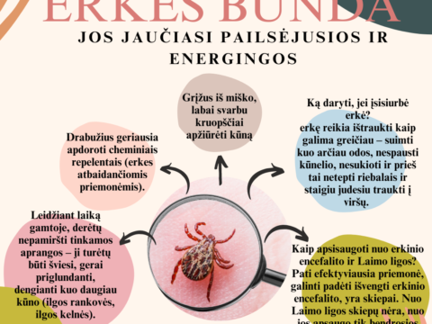 Erkės tai 0,5 iki 15 mm dydžio išoriniai parazitai. Erkės prisitvirtina prie gyvūnų ar žmonių odos, įsisiurbia į jos paviršių ir maitinasi krauju. Erkės veisiasi ne tik miškuose ir pievose, bet ir miestų parkuose bei soduose. Jos negali šokinėti ar skraidyti, todėl prisitvirtina prie gyvūnų ar žmonių odos, kai ši liečiasi su žole. Erkės pačios ligų nesukelia, tačiau jei erkės yra infekuotos, jos gali per įsisiurbimą perduoti infekcijas žmogui. Tokiu būdu erkės gali užkrėsti žmones ligomis, įskaitant erkinį encefalitą, Laimo ligą. Leidžiant laiką gamtoje, derėtų nepamiršti tinkamos aprangos – ji turėtų būti šviesi, gerai priglundanti, dengianti kuo daugiau kūno (ilgos rankovės, ilgos kelnės). Drabužius geriausia apdoroti cheminiais repelentais (erkes atbaidančiomis priemonėmis). Grįžus iš miško, labai svarbu kruopščiai apžiūrėti kūną. Ką daryti, jei įsisiurbė erkė? Erkę reikia ištraukti kaip galima greičiau – suimti kuo arčiau odos, nespausti kūnelio, nesukioti ir prieš tai netepti riebalais ir staigiu judesiu traukti į viršų. Kaip apsisaugoti nuo erkinio encefalito ir Laimo ligos? Pati efektyviausia priemonė, galinti padėti išvengti erkinio encefalito, yra skiepai. Nuo Laimo ligos skiepų nėra, nuo jos apsaugo tik bendrosios profilaktinės priemonės. Mokyklos sveikatos specialistė Kristina Usonienė