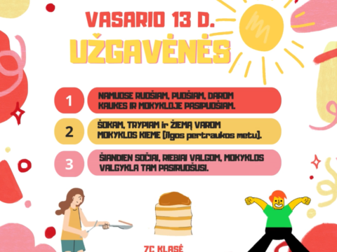 Tradicinis Užgavėnių valgis visoje Lietuvoje – blynai. Per Užgavėnes kiekvienas į namus užsukęs žmogus turėdavo ragauti šaltienos, kitų mėsiškų valgių; jų negalima palikti, nes kitą Pelenų dieną prasideda gavėnios pasninkas. Užgavėnėms būdinga kaukėtų, neatpažįstamų persirengėlių vaikštynės. Persirengėliai parodijuodavo persenusių jaunikių piršlybas, apsimetėlį elgetą, mainikautoją čigoną, keliaujantį pirklį žydą, vaidindavo raganą, giltinę, velnią, ožį, gaidį, gervę arba vežiodavosi baidyklę. Pagrindiniai personažai – storulis Lašininis, liesasis Kanapinis ir Morė. Užgavėnes mokykloje švęsime vasario 13 d. (antradienį). Kviečiam visus prisidėti prie šios šventės ir gąsdinti žiemą, kad kuo greičiau ateitų pavasaris. 7c klasė
