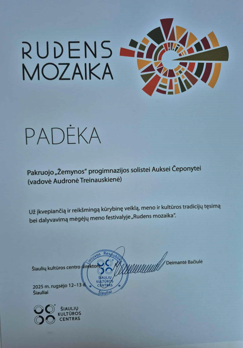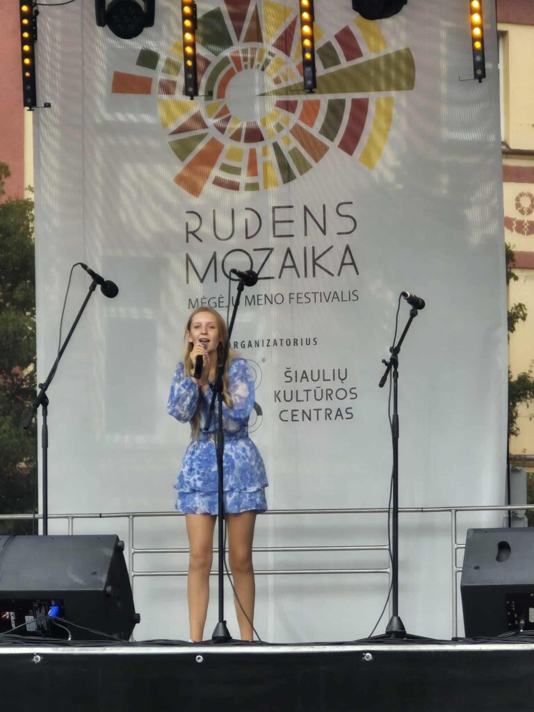 Rugsėjo 12 d. Šiauliuose P. Višinskio aikštėje vyko Mėgėjų meno festivalis „Rudens mozaika 2025“, skirtas Šiaulių dienoms paminėti. Jame pasirodė ir dvi dainas padainavo Vokalo studijos solistė Auksė Čeponytė, kurią į Šiaulius nuvežė jos tėveliai. Džiaugiuosi ir nuoširdžiai dėkoju Auksei už puikų pasirodymą, tėveliams už pagalbą ir rūpestį.