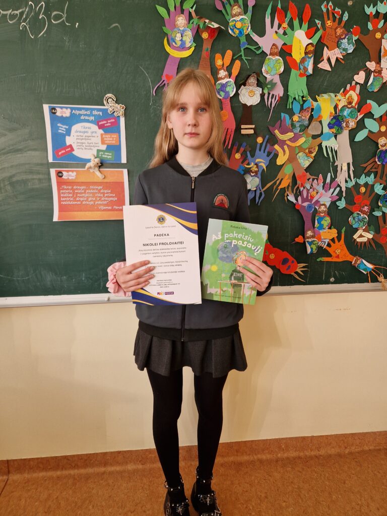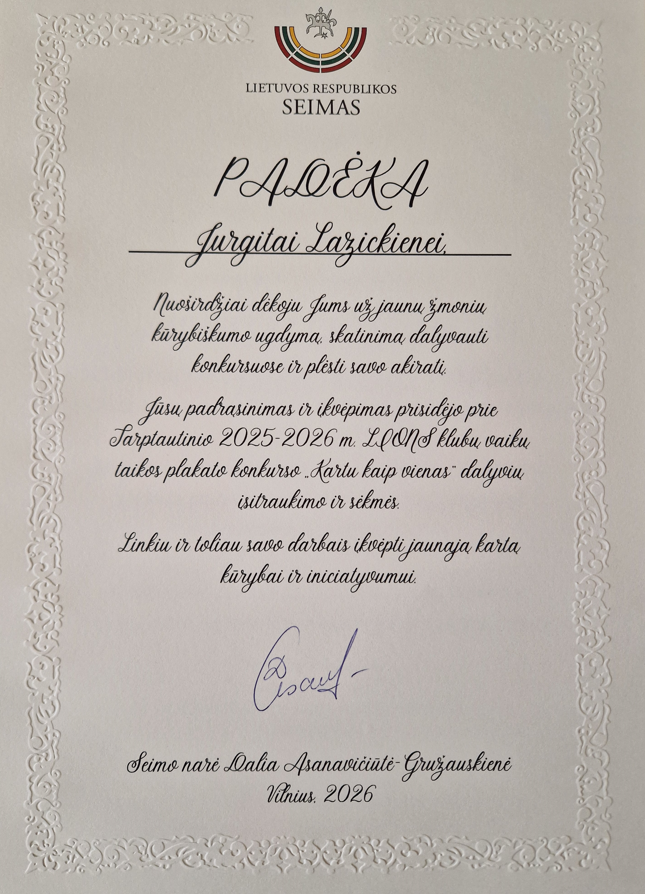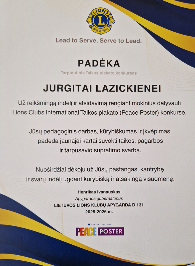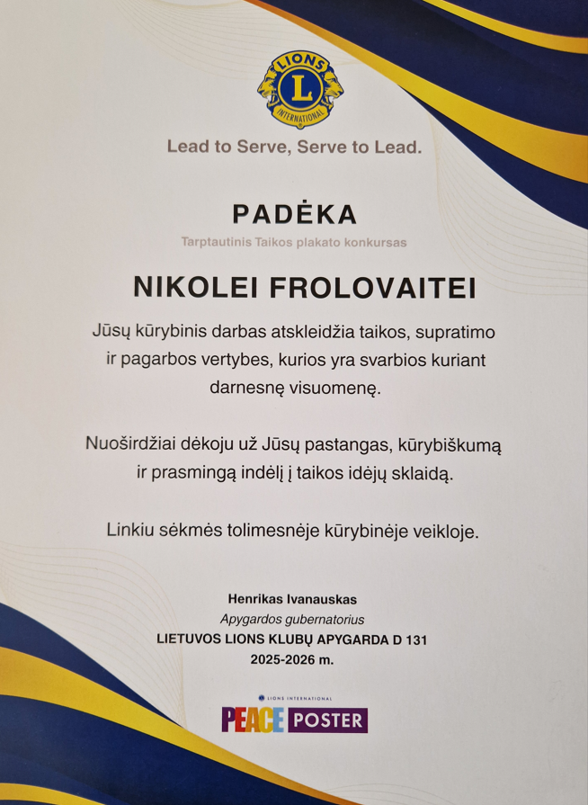 Lietuvos Respublikos Seime kovo 20 d. Lietuvos LIONS klubų apygardos gubernatoriaus Henriko Ivanausko ir seimo narės Dalios Asanavičiūtės-Gružauskienės padėkomis buvo apdovanoti tarptautinio taikos plakato konkurso laureatai ir juos konkursui ruošę mokytojai. Mūsų mokyklos 7a klasės mokinė Lėja Grybaitė, laimėjusi rajono etape1-ąją vietą, buvo pakviesta dalyvauti parodos atidaryme. Nors ji ir 2-os vietos laimėtoja Leta Lebedaitė mokosi mūsų mokykloje, savo sukurtais plakatais atstovavo J. Pakalnio menų mokyklą. 3-ąją vietą garbingai užėmė 6b klasės mokinė Nikolė Frolovaitė. Ji sukūrė plakatą, kuris išsiskyrė brandžia idėja, kruopščia kompozicija ir jautriu požiūriu į taikos simboliką. Tai reikšmingas pasiekimas, atskleidžiantis mokinės kūrybiškumą, pastangas ir gebėjimą meniškai išreikšti visuomenei svarbias vertybes.