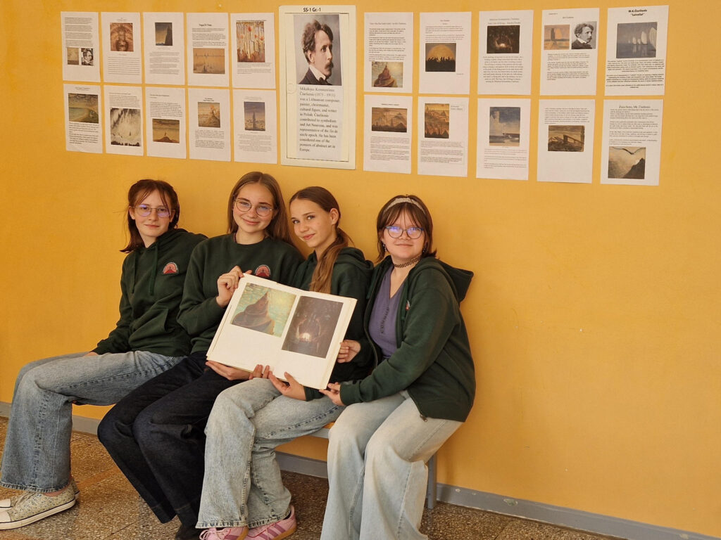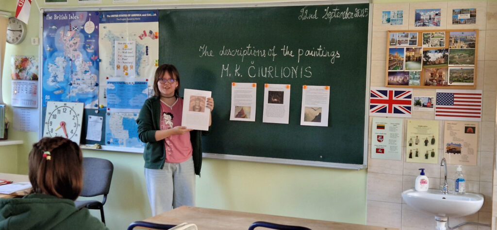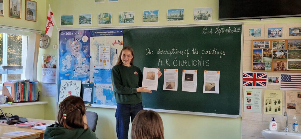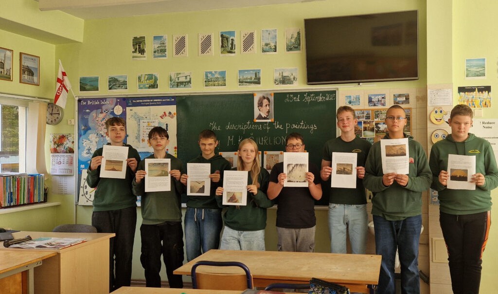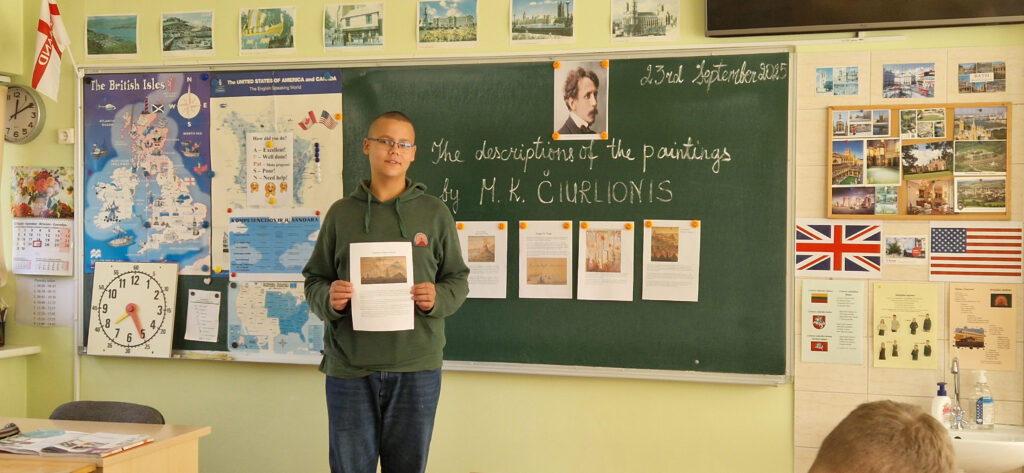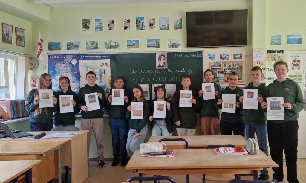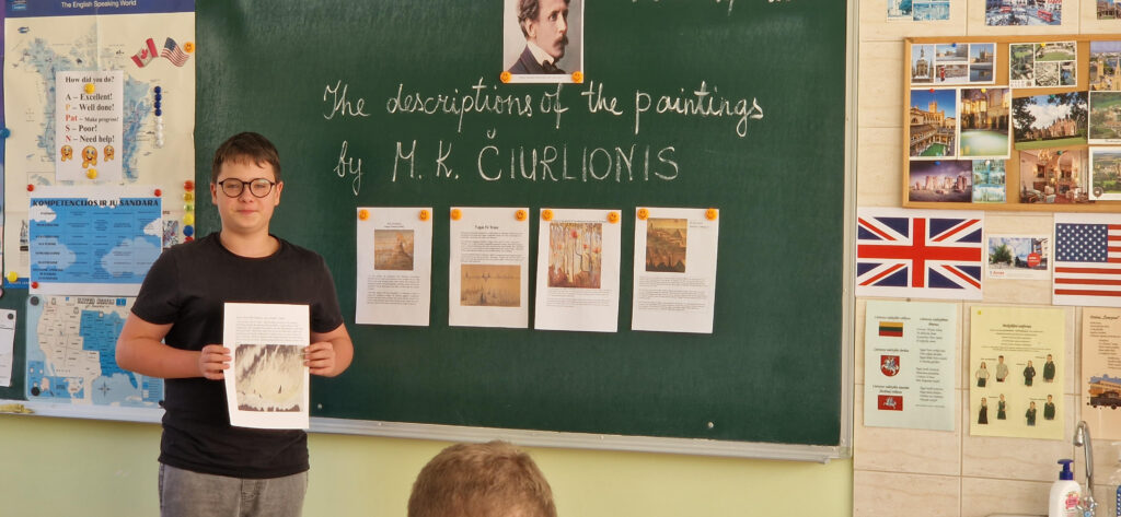 Kaip mūsų šalies ambasadoriai, 7A ir 8B klasių mokiniai išsirinko po vieną M. K. Čiurlionio paveikslą iš „luxart.com“ interneto svetainės ir naudodamiesi kompiuteriu paruošė pasirinkto paveikslo pristatymą – aprašymą anglų kalba pagal pateiktą paveikslo aprašymo planą su pagrindinėmis angliškomis frazėmis. Savo darbus mokiniai pristatė savo klasės draugams ir, mokytojai pasiūlius, sukūrė edukacinę erdvę, skirtą paminėti M. K. Čiurlionio jubiliejinį 150-ąjį gimtadienį. Visi mokinių paruošti darbai yra eksponuojami prie 114 anglų kalbos kabineto.