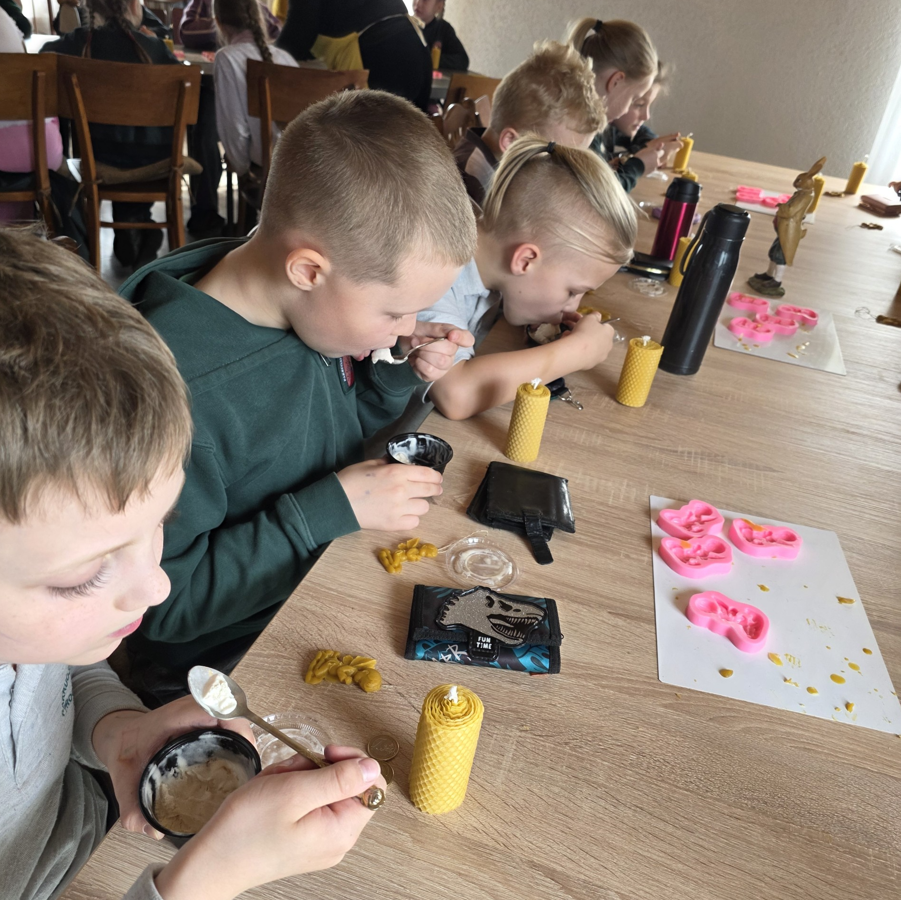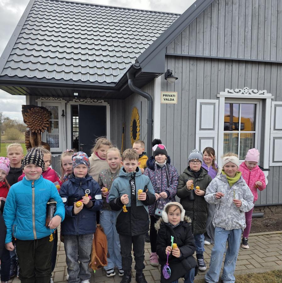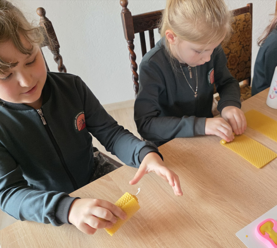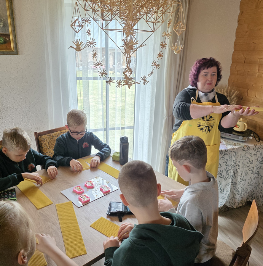 Kovo 26 dieną 1a klasės mokiniai lankėsi sodyboje „Molinė saulėgrąža“, kurioje vyko žvakių gaminimo edukacija. Pirmiausia mokinai pasigamino žvakę, o paskui kūrė mielus pakabučius – angeliukus. Po aktyvios veiklos pirmokai pirmą kartą ragavo ledų su chalva. Šis netikėtas derinys maloniai nustebino – skonis pranoko visų lūkesčius! Vėliau edukatorė pakvietė apsilankyti sodybos muziejuje, kuriame mokiniai susipažino su senoviniais rakandais bei apžiūrėjo įspūdingą ąsočių kolekciją.