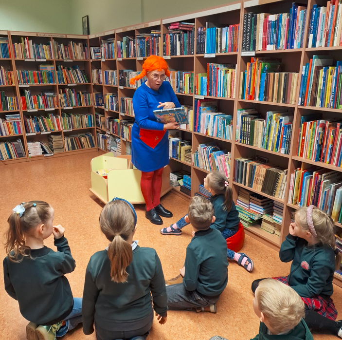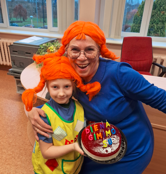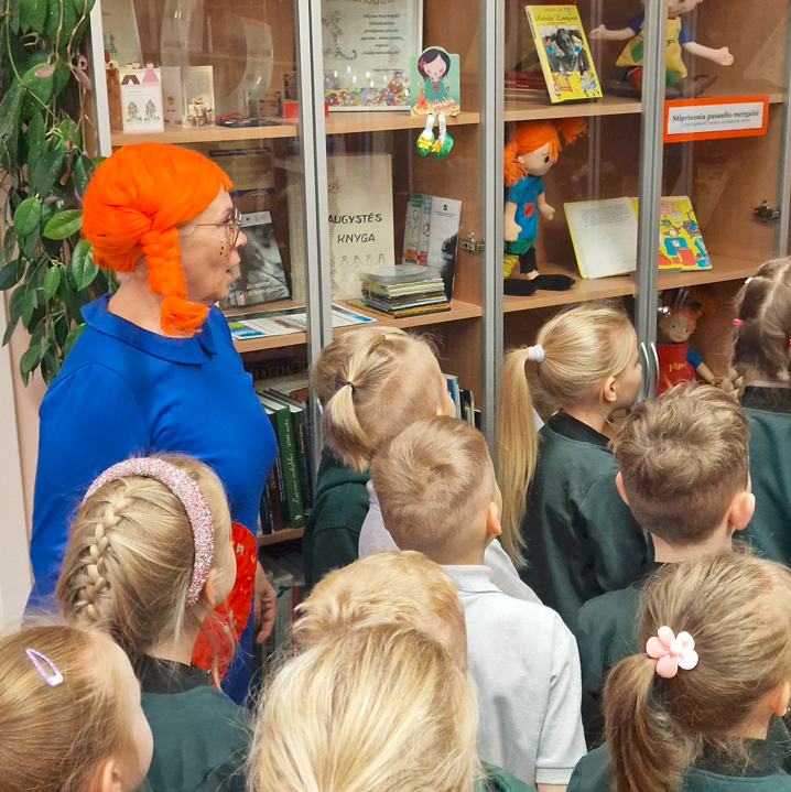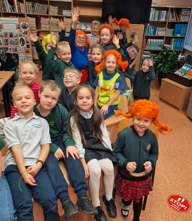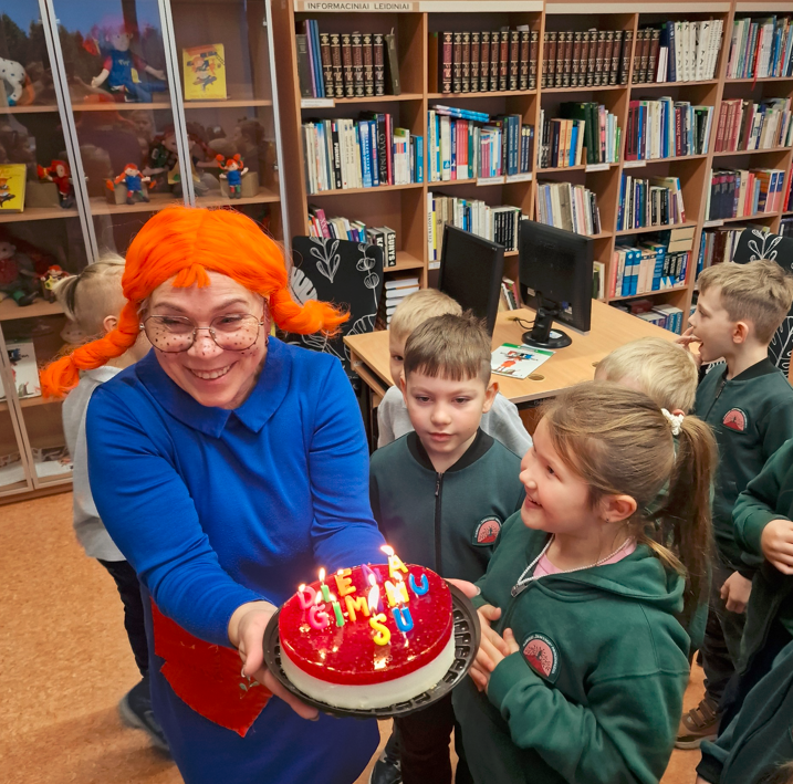 Ankstų pirmadienio rytą 1a klasės mokiniai lankėsi mokyklos bibliotekoje, kur juos pasitiko smagioji Pepė Ilgakojinė (bibliotekininkė Asta Sutkienė). Šiais metais sukanka net 80 metų nuo pirmosios Astridos Lindgren knygos apie Pepę pasirodymo! Jubiliejaus proga pirmokėliai padovanojo Pepei tortą ir pačių užrašytus sveikinimo atvirukus. Pepė noriai papasakojo apie save ir savo nuotykius, parodė surinktą Pepių Ilgakojinių lėlių kolekciją, padrąsino vaikus nebijoti būti drąsiais, išradingais ir truputį kitokiais žmonėmis. Pepė sakė, kad skaitymas – tai stebuklingas būdas pamatyti pasaulį kitaip: užsimerki, įsivaizduoji ir nuotykis prasideda!