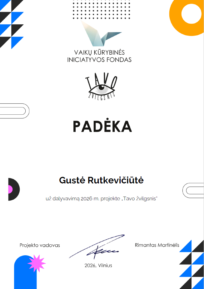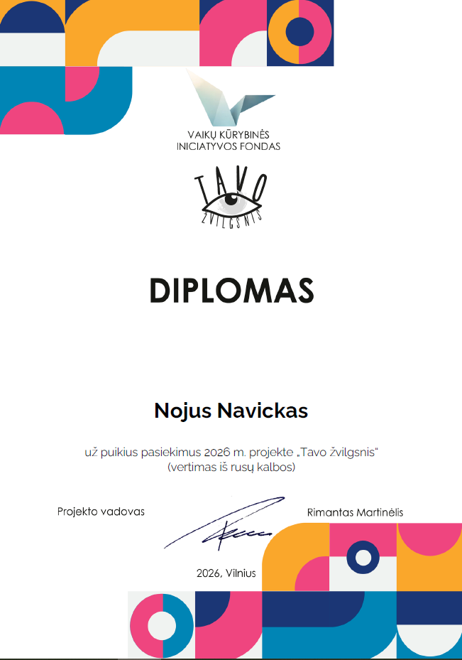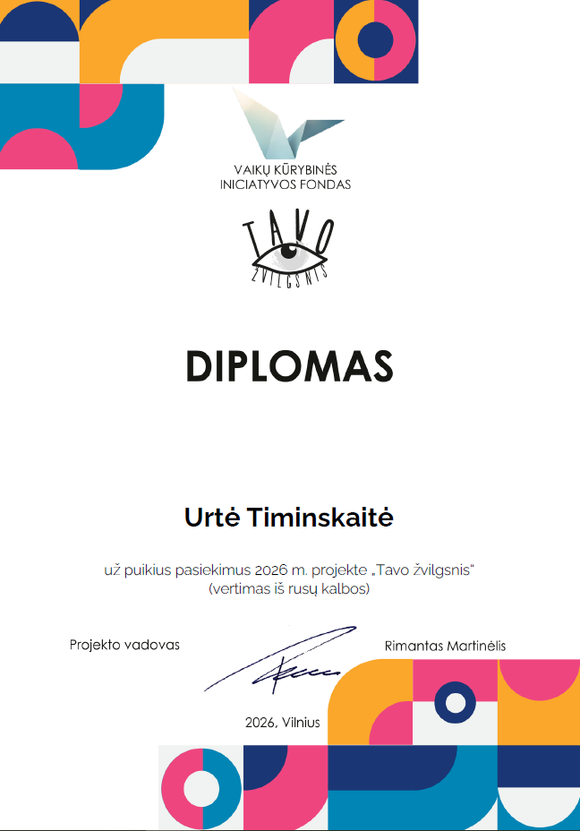 Kasmet mūsų mokyklos 7–8 klasių mokiniai dalyvauja respublikiniame vertimų ir iliustracijų konkurse „Tavo žvilgsnis“. Šiais metais vertimų iš rusų kalbos konkurse dalyvavo aštuoni 7–8 klasių mokiniai. Jie pasirinko versti trumpesnius tekstus. Vieni buvo apie Mocartą, kitiems patiko tekstas apie kelionę dviračiu, treti rinkosi pasaką. Nors kai kurių tekstai sutapo, tačiau išversti tekstai skyrėsi. Mokinių darbai buvo įvertinti padėkomis bei diplomais. Džiaugiuosi mokiniais, kurie nepabūgo, dalyvavo konkurse ir pademonstravo geras rusų kalbos žinias.